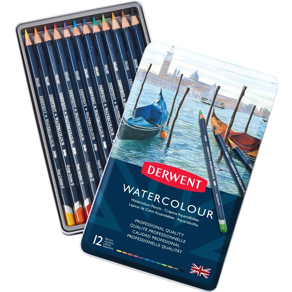 12db-os Derwent Akvarellceruza-készlet (vízoldható művészceruzák) fém ceruzatartóban. Ideális alternatív akvarellfestéshez, színkeveréshez és rétegezéshez. Professzionális minőség