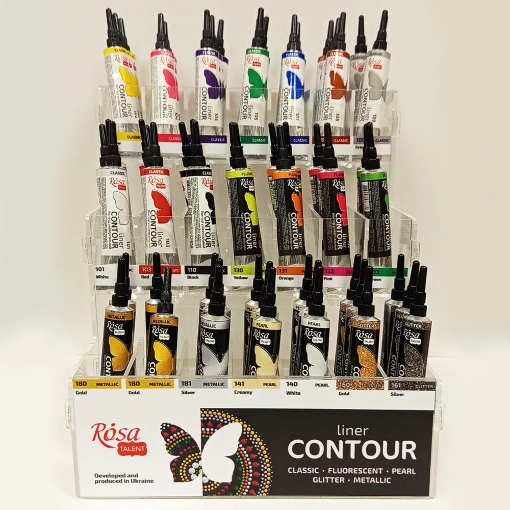 A ROSA Talent akril kontúrfesték elengedhetetlen a kézművességhez és a dekoráláshoz. Használható díszítő minták készítéséhez, képek textúrálásához, dekoratív gyöngyhatás létrehozásához vagy pontfestmények, mandalák készítéséhez.