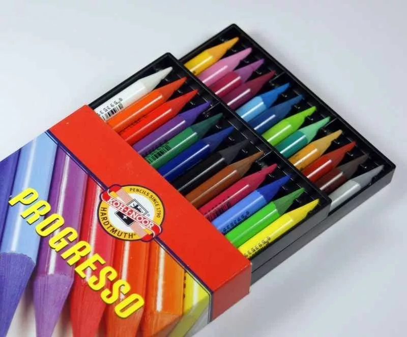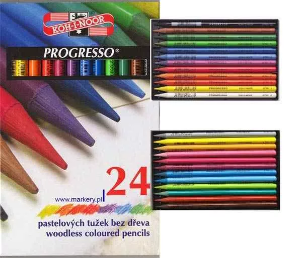 A KOH-I-NOOR Progresso (minimális viaszos/olajos kötőanyaggal ceruzaalakúvá préselt pigment) egy, a hardpasztellhez vagy nagyon puha szinesceruzához hasonlatos színesrúd fa foglalat nélkül.