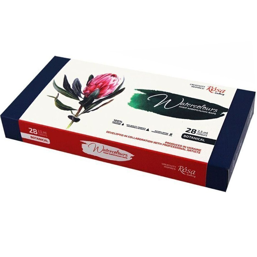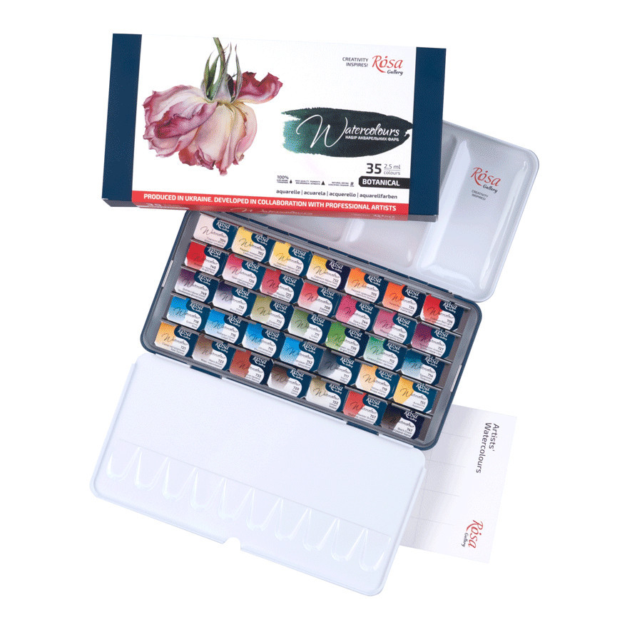 ROSA Gallery Fine Art watercolours are made from organic gum arabic, organic and inorganic pigments of the highest quality, finely ground. The special feature is the development of Pink colours in collaboration with professional artists. In the initial stage, the main features of the colours are defined, such as the colour palette, the transparency and intensity of each colour, the consistency of the colour and the lightness of the brush. Then several painting samples are subjected to an expert evaluation and testing. Then, taking into account the observations and preferences of the artists, the colour is perfected to start series production. ROSA Gallery Fine Art watercolours are designed and manufactured in Ukraine. High-quality materials, professional approach and modern special equipment guarantee the highest product quality. Organic and inorganic pigments. Organic shellac. High light fastness. High pigment concentration. Clear and vibrant colours. Easy dilution and brush properties. The blue metal tin contains 35 colours of 2.5 ml as shown in the table.
