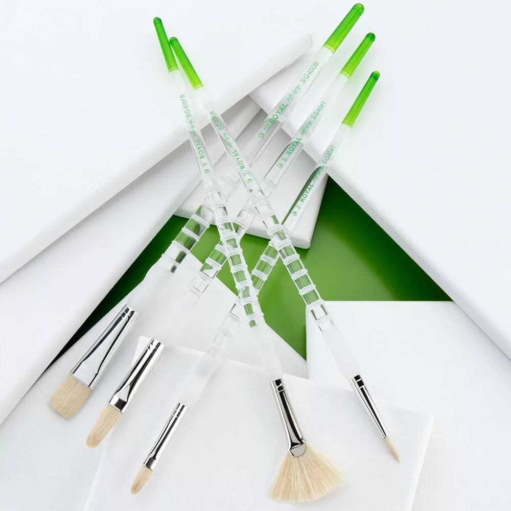 Royal & Langnickel Soft-Grip is made of natural fibre and acrylic handle with non-slip rubber grip for extra comfort. The flexible fibres provide great colour absorption while the surface roughness is perfectly moulded. The clear acrylic handle is securely attached to the brush bristles by a metal ring. Unlike wooden brush handles, this handle is resistant to prolonged soaking, will not swell from water and will not separate from the adhesive, so the brush strokes stay firmly in place.